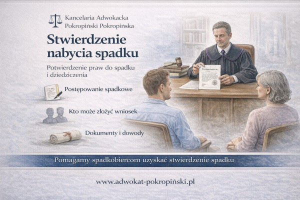 Obsługa sprawy obejmuje analizę sytuacji rodzinnej i majątkowej, przygotowanie wniosku o stwierdzenie nabycia spadku, zgromadzenie wymaganych dokumentów oraz reprezentację w toku postępowania sądowego.